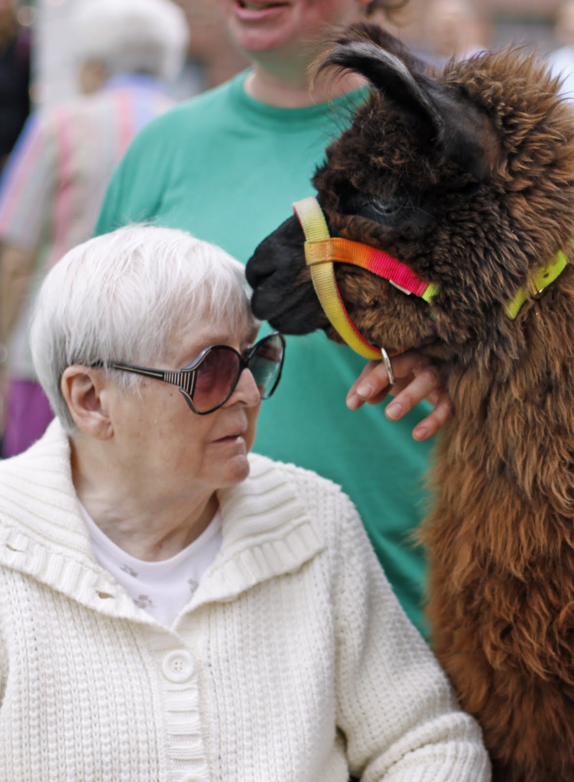 Blanche Carlson, gets sniffed by Heresy Kiss, a llama brought in by Spitfire Ranch Mobile Petting Zoo during the Gorecki Care Center petting zoo and backyard social at St. Benedict's Senior Community in St Cloud.